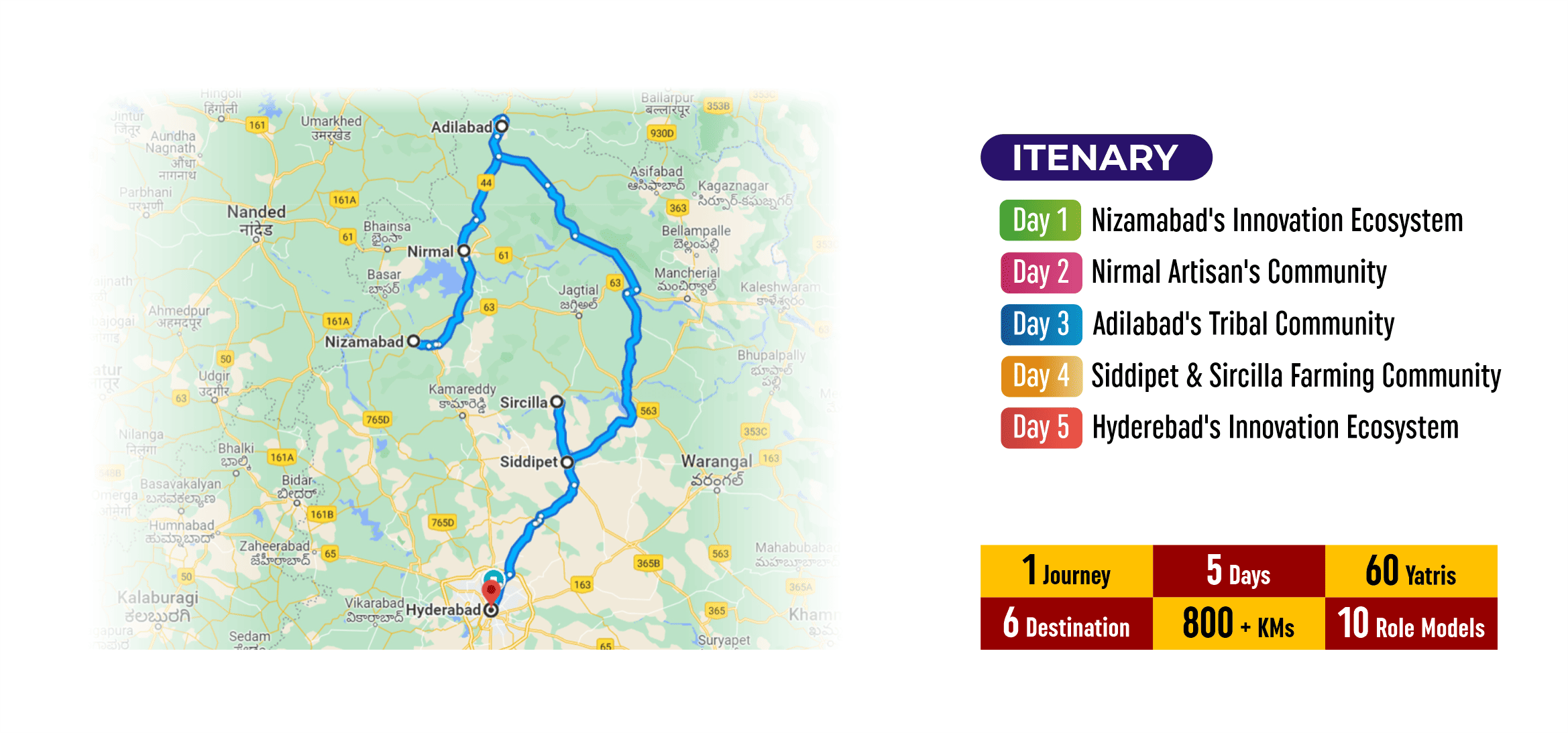 Innovation Yatra is a unique 5-day bus journey designed to foster innovation and entrepreneurship by inspiring and empowering individuals to become innovators in their own right. The primary objective of this Yatra is to introduce participants, or "yatris", to the vibrant innovation ecosystem of Telangana, with a specific focus on unsung heroes from rural Telangana who are local innovators. Through this immersive experience, yatris will not only learn about the challenges faced by these innovators and the communities that they deep dive with but will also be introduced to design thinking principles, enabling them to develop innovative solutions to the problems in the days to come.